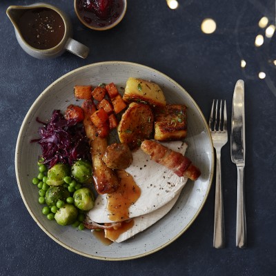 - Roast Turkey with Pork and Sage Stuffing, Roast Potatoes, Pig in Blanket and Seasonal Vegetables
